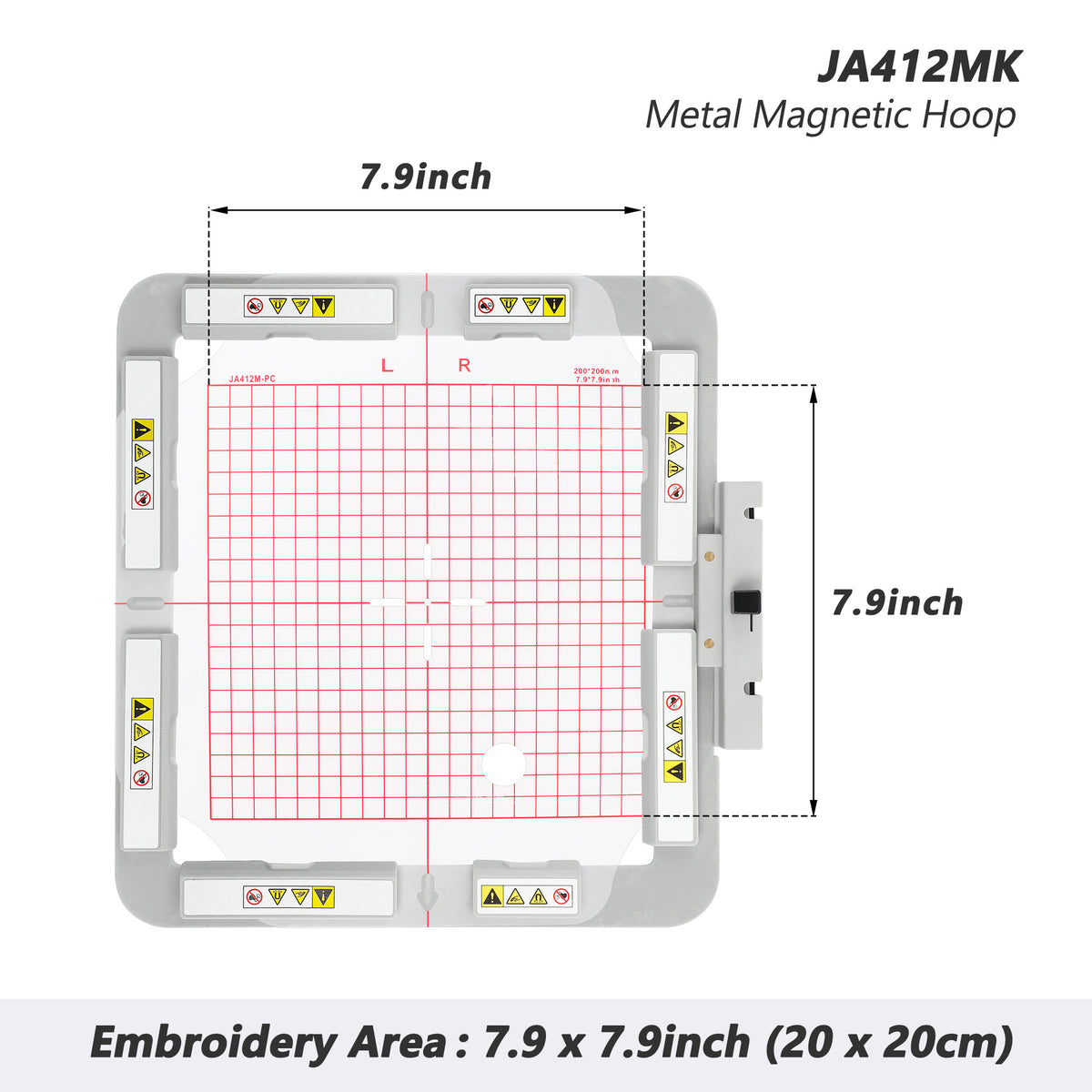 JA412MK: 1 x Magnetic Embroidery Hoop (SQ20B Metal Embroidery Hoop); 8 x Magnets; 1 x Grid Template.