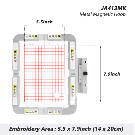 JA413MK: 1 x Magnetic Embroidery Hoop (RE20B Metal Embroidery Hoop); 8 x Magnets; 1 x Grid Template.